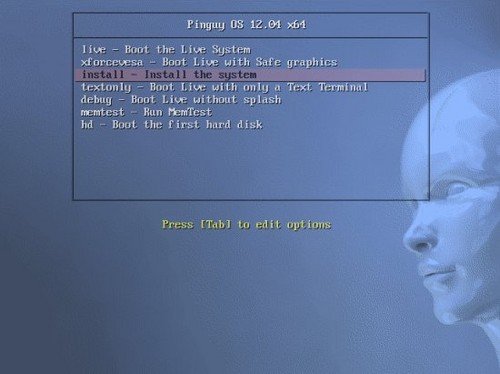 从启动的安装光盘中,我们可以看到七个选项,你可以按“Tab”键进行切换选择。我这里选择的是第三个,安装Pinguy OS。