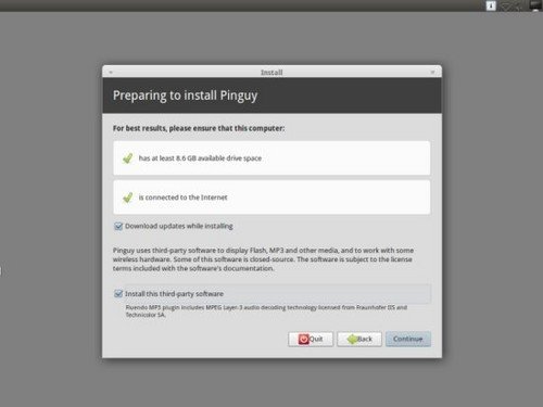 这个页面是安装前的准备,首先你要满足两个方面,就是硬盘空间不能小于8.6GB的空间,而且要链接Internet。