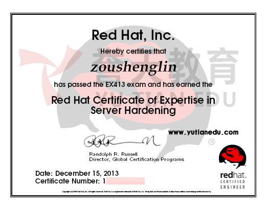 誉天金牌Linux讲师邹老师于2013年12月14日和15日一次性通过红帽云计算专家(IaaS)EX210和服务器硬化EX413两门认证考试,成为国内最早通过该两门认证的专家之一。作为国内红帽Linux培训行业的领头羊,誉天除了之前在全国首推RHCA、RHCVA、RHCSS等高端前沿的红帽认证课程,本次同样在国内率先开设了红帽最新出炉的云计算专家(IaaS)CL210和服务器硬化RH413课程。据悉,截至2013年11月,誉天已通过79名RHCA,508名RHCE,在国内独占鳌头。