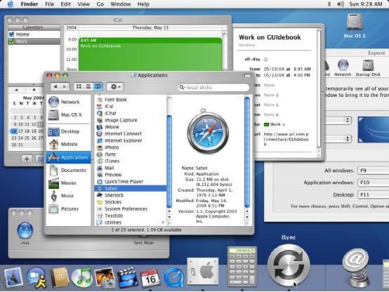 另外,在OS X 10.3 Panther中,著名的Expose视窗管理器也首次亮相,为用户提供了一个在不同窗口之间快速切换的新工具。另外,iChat AV还添加了对视频及音频会议的支持、全系统字体管理器、与Windows系统的互通性以及PDF渲染性能提高。另外在Find和TextEdit等文档编辑中也增加了对zip的支持,并且在Panther中Safari也彻底取代了原来的微软IE,作为OS X系统的默认浏览器。