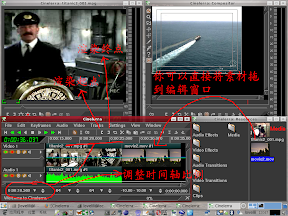 在上右图中,我导入了第二个视频片断,并且直接将其拉入主工作区,让其位于第一个素材的后面,使用这样的方法,就可以将多个视频连接成一个视频了。图中还指示了调整时间轴比例的按钮以及时间轴的位置,以及设定最终渲染范围的起点和终点按钮的位置。