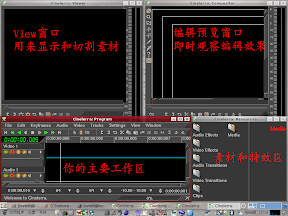 OK,开始正题,如何使用。下面的两副图是cinelerra的启动画面和工作区介绍,cinelerra希望自己能够做到象编辑文本文件一样编辑视频文件,它追求的是强大的功能而不是界面的美观和易用,因此,就我的感觉来说,cinelerra的好多图标实在是太简陋了。