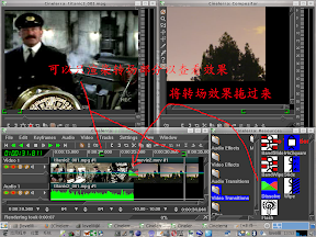 让我们来给我们的编辑工作加点花哨的东西,使用转场效果。选择素材库中的Video Transaction文件夹,在其中选择一个转场效果,将其拖拽到两段视频的中间位置。你可以在你拖拽过来的转场效果上右键设置其参数,然后将渲染范围指定到转场效果附近,包含转场效果,然后进行渲染以观察转场的最终效果,如上右图所示。