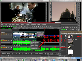 最后,让我们来增加背景音乐和字幕。在已有的Audio1 通道上点击右键,选择Add track来增加一个声音通道,导入一个mp3素材,将其拖到新产生的Audio2通道上,这样就可以有一个背景音乐了。如上左图所示。
