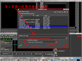 导入素材的窗口如上右图所示,通常来说cinelerra最善于操作没有压缩的mpg或者mov格式,但是你不妨尝试一下你的原始素材是否被cinelerra支持,注意默认的选项将使用这个素材替换整个工程,通常你应该选择 Create new resources only。
