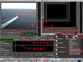 在成功导入素材以后,你可以把素材拖到view窗口来选择素材的一部分进行编辑,选择的方法是,使用View窗口播放或者拖拽素材到起点的地方设置分割起点,到终点的地方设置分割终点,然后点击插入到工作区的按钮。上左图演示了这些按钮的位置,在图中还标明了两个按钮,拷贝粘贴模式让你在工作窗口中使用编辑文本的方式(选中,拷贝,粘贴)来编辑视频,拖拽的方式则将每个加入工作区的素材片断视为一个整体。图中右下角的地方标出的在素材上点右键选择Match frame rate的菜单,如果你发现最终渲染的结果的速度和正常速度不一样,你可能需要点一下这个菜单。
